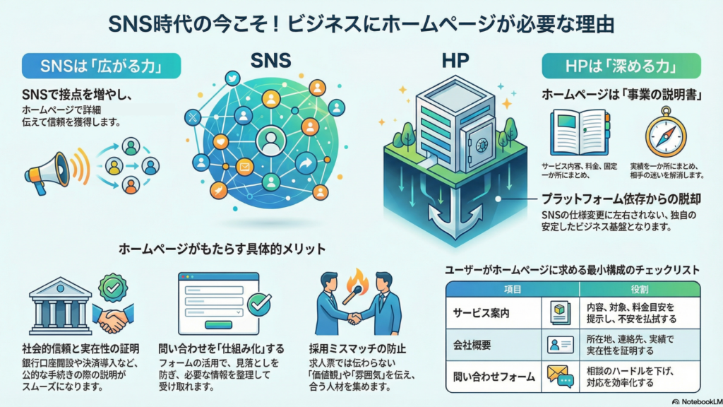 一方でホームページは、会社や事業の情報をきちんとまとめておき、相手が安心して判断できる材料を揃える場所です。