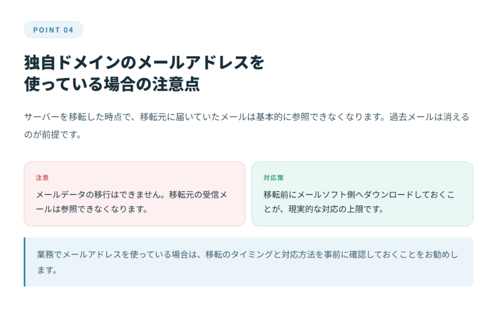 ドメインの話の延長で、もう一点お伝えしておきたいのですが、独自ドメインのメールアドレス(例:info@〇〇.com)を使っている場合は、過去のメールデータが移行できないのが前提です。