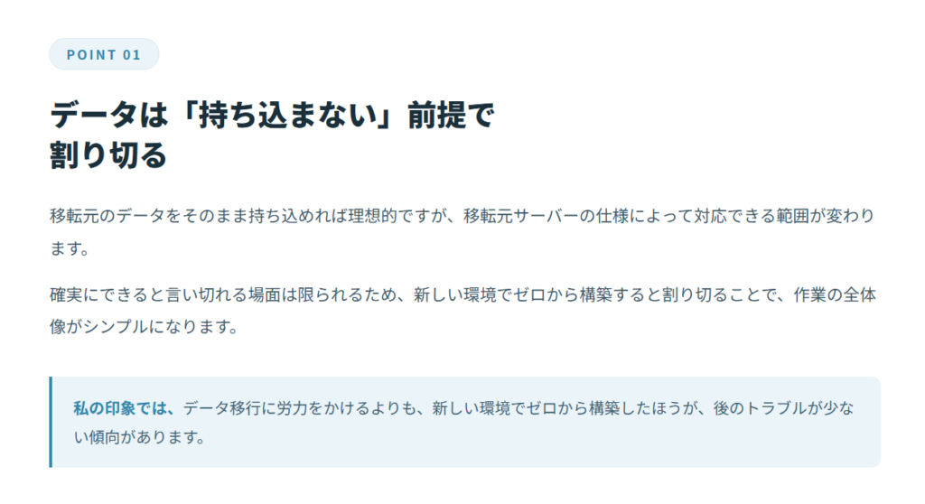 データ移行に労力をかけるよりも、新しい環境でゼロから構築したほうが、後のトラブルが少ない傾向があります。