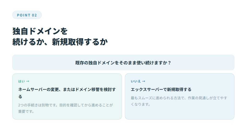 既存の独自ドメインを継続して使いたい場合は、そのドメインの参照先を新しいサーバーへ切り替える作業が必要になります。
