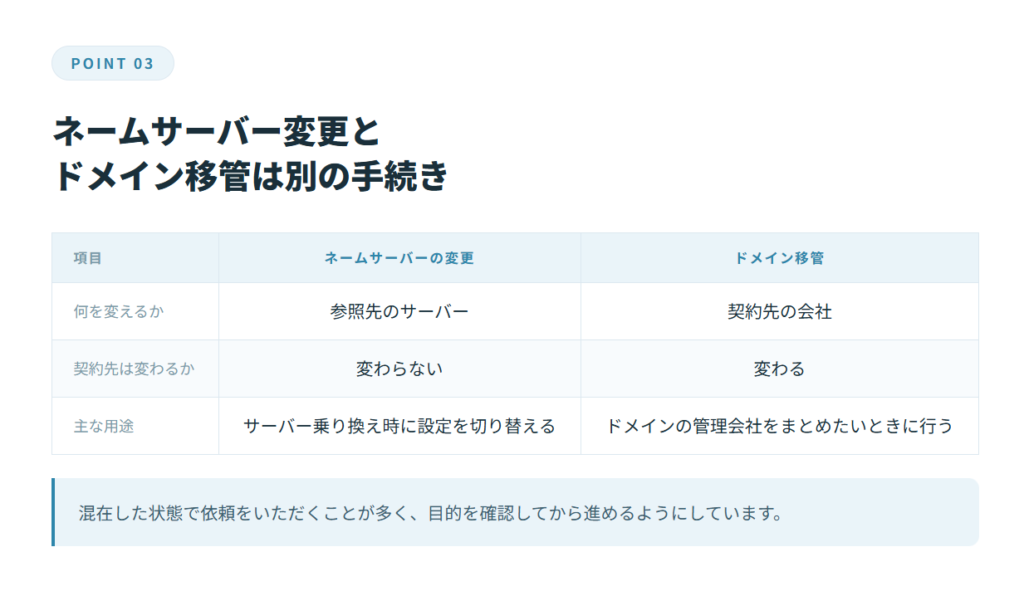 ドメインは継続利用か新規取得かによって手続きが変わり、継続する場合はネームサーバーの変更とドメイン移管のどちらが目的に合っているかを先に確認することが大切です。