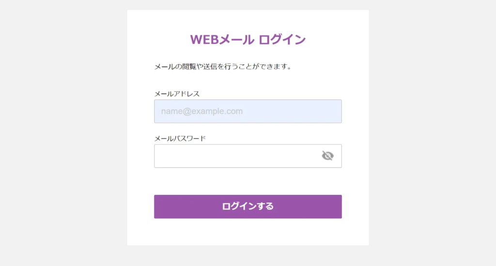 WEBメールログイン画面 にアクセスし、メールアドレスとメールパスワードを入力します。