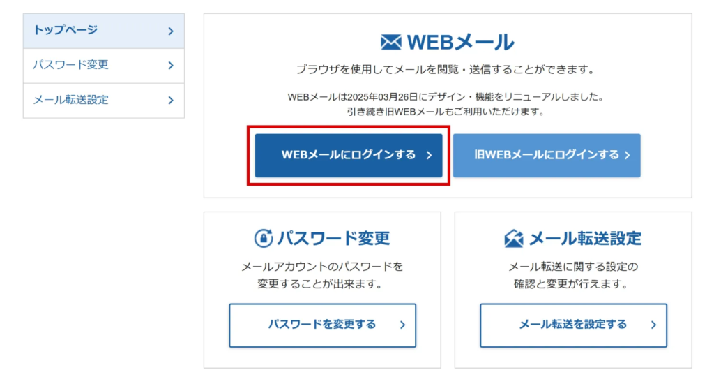 表示されたメールパネルの[WEBメールにログインする]をクリックします。