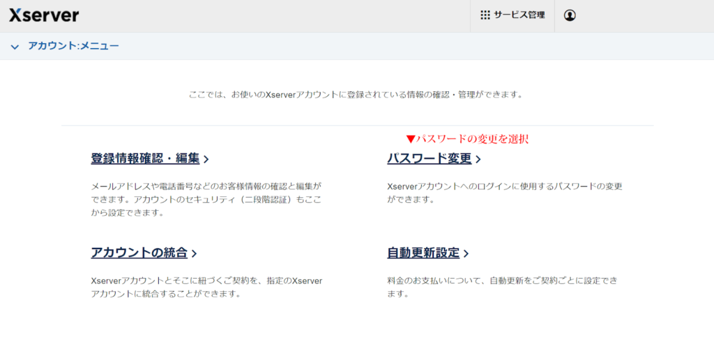 Xserverアカウント(会員ID)のパスワードを変更したい場合は、ログイン後、「パスワード変更」をお試しください。
